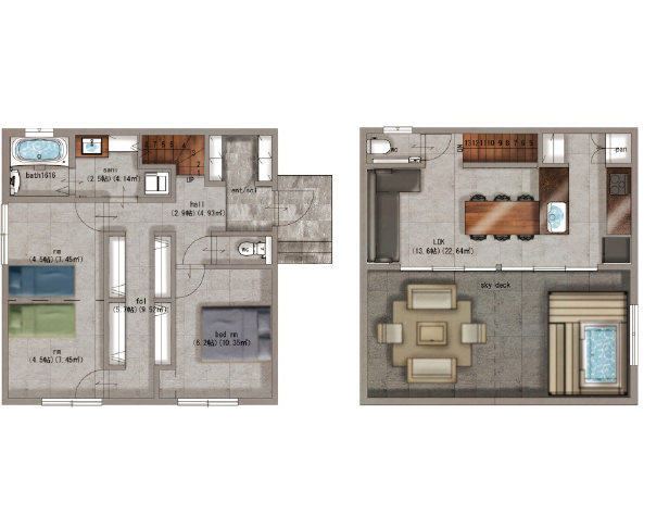 二階リビングと併設する大空間のバルコニーを中心に計画された遊び心あふれるプランの数々。どのプランもバルコニーのポテンシャルを最大限に引き出した「遊ぶ」ための住空間に仕上がっております。理想の土地やお持ちの土地を設定し、それに当てはまる大きさの間取りをセレクトしてください。